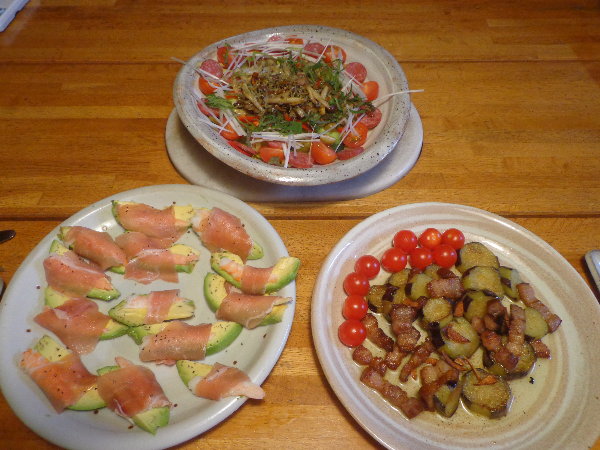 下左はアボカドのスライスをエビと生ハムで巻いたもの、下右は最近お気に入りの茄子とベーコン炒め。これが滅茶旨い。手作りベーコンならではの濃厚な味わいで、ベーコンの味の沁みた茄子が大感激の旨さとなりますよ。
