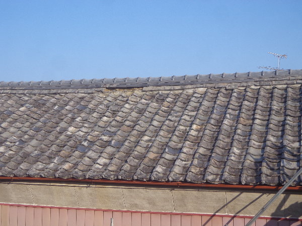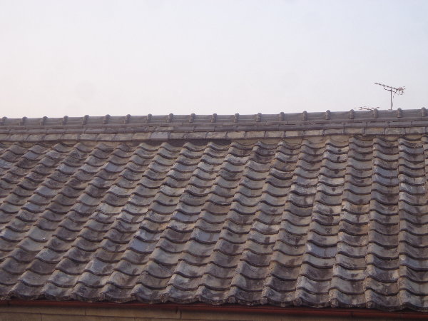 壊れた瓦が落ちて散乱しています。