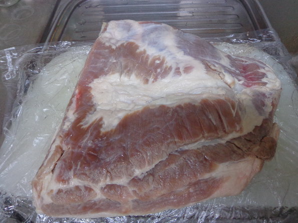☆まずは1週間ピクルス液に漬けた豚バラ肉を、一晩水に浸し、翌朝2時間ほど流水で塩抜きしました。