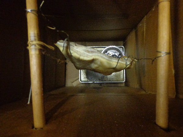 それで丸一日冷蔵庫で乾燥させ、夜になってまずスモーカーに炭を入れ、ホームセンターで買ってきたミニファンヒーターで温風を送りながら50度で2時間近く乾燥させ、それからスモークウッドで燻製を掛けました。