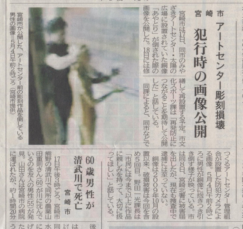 ☆今朝の宮日新聞社会面に、宮崎アートセンターに設置してある満木さんの作品を壊してしまった犯人の、防犯カメラによる画像を公開する記事が掲載されました。