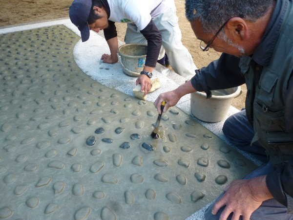 感触がつかめたので、作業にかかりますが、玉石を選別し一個一個並べてたたきながら埋めていく作業は大変なものです。