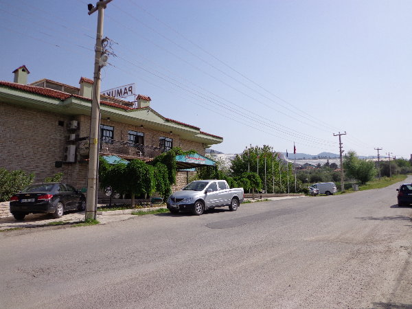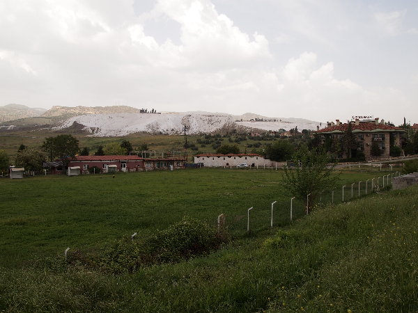 ☆夕刻のホテル周辺。右端がホテル。向こうの白い丘がパムッカレ。
