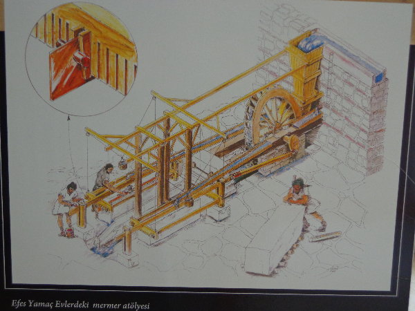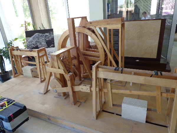ローマ時代の遺跡のレリーフと発掘された遺構から復元されたスラブ材(板石)を切る水力動力によるオートマチックなシステム。