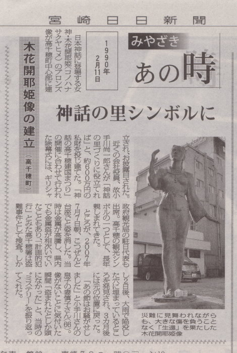 ☆今朝の宮崎日日新聞「みやざき あの時」コーナーに、私の制作した高千穂町の木花開耶姫像が紹介されていました。