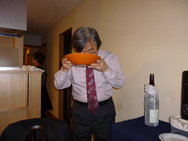 庚申碑に注いだお神酒をみんなで回し飲みして、皆さんの家内安全、商売繁盛、そして何よりは皆さんの健康を祈念します。