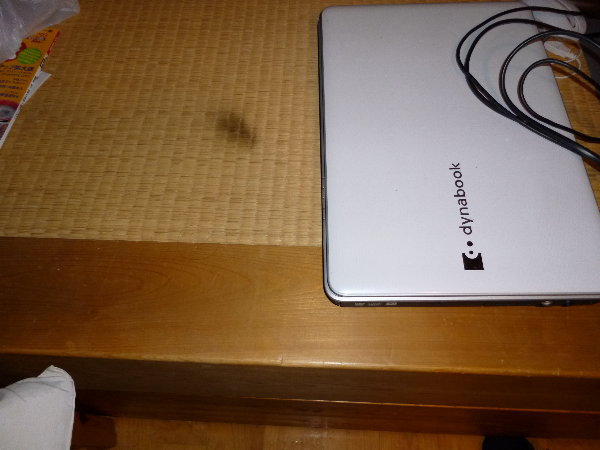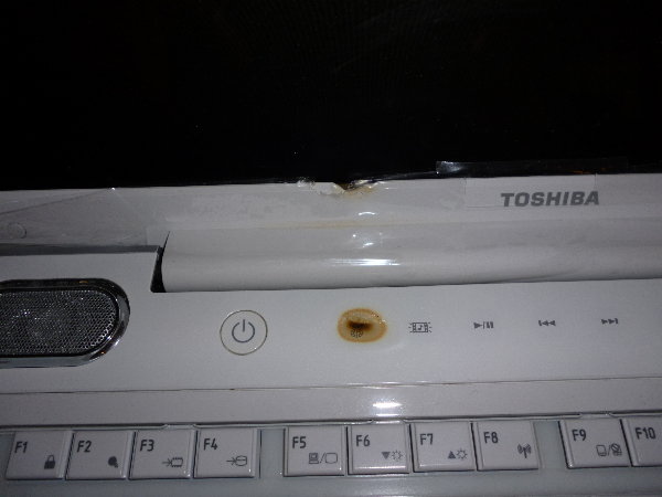 妻のパソコンが起動したまま蓋を被せてあったので開いてみると、なんとパソコンのecoボタンが焦げていて、蓋を被せていたので液晶部分も溶けているではありませんか。