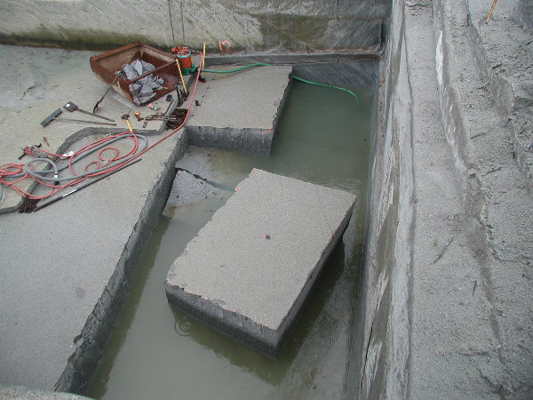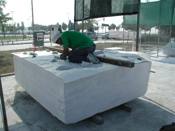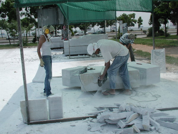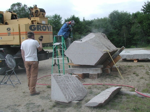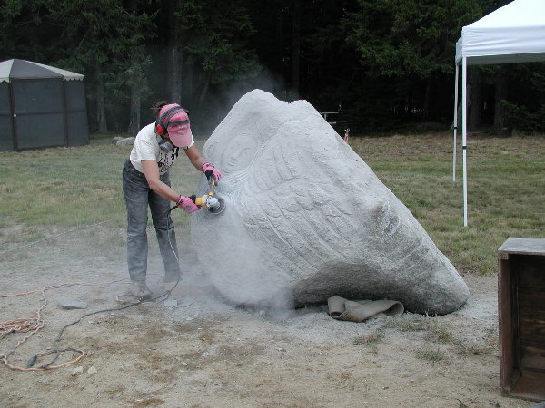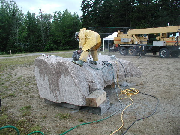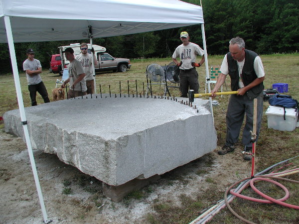 ☆シンポジウム会場へ戻ると、ジム(カナダ)がルートハンマーとせり矢による石割を進めていました。