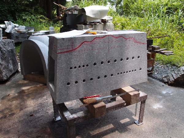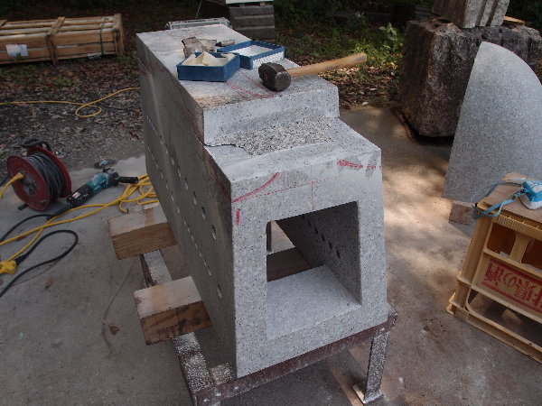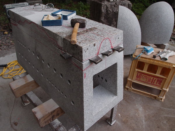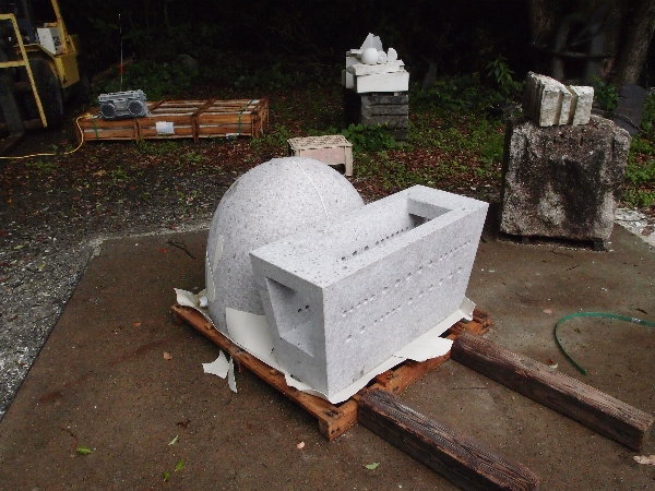 あかりモニュメントの石荷を開く Packing of the stone is opened.