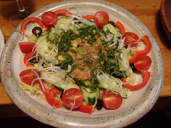 サラダに、スモークサーモンとアボカド、塩麹、黒胡椒を練り合わせたものをドレッシングとして合え、大葉、白ネギをトッピングしてみたら、とても上品な食感のサラダとなりました。