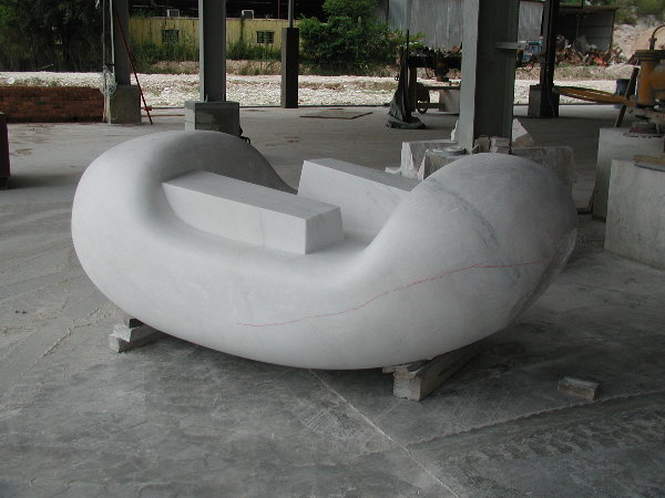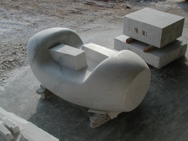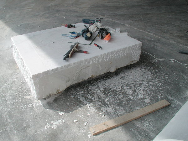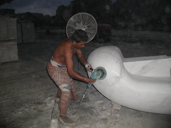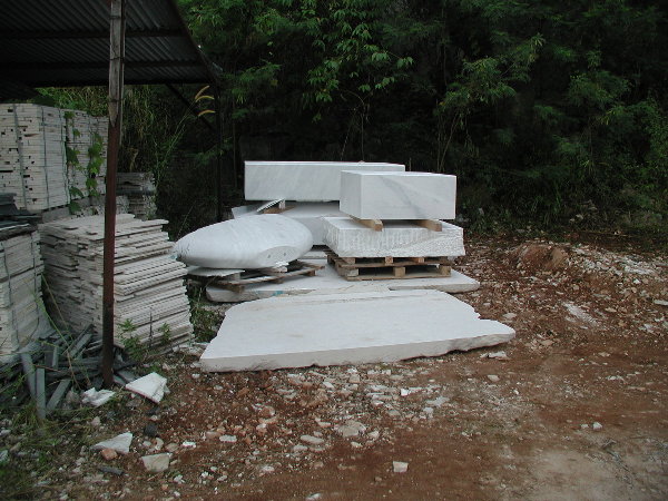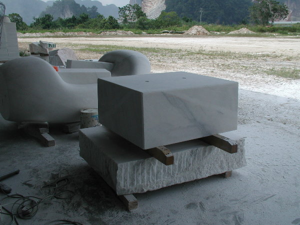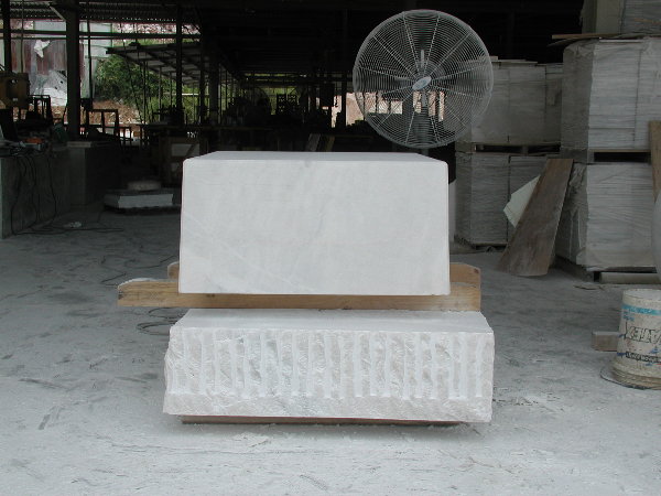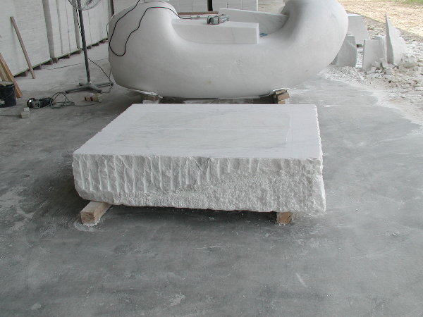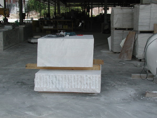 ☆さらにもう一つの切削した台座も全くレベルが出ておらず、形も平行四辺形になっています。(Aslamが指示して従業員が切削)しかも切削機の上での石の返しにリフトを使ったらしく、全面にリフトの爪の突き傷と角欠け状態で、泣きたいほどの無残な姿なのです。これを全部修正していたのでは2日はかかります。明日の午後3時くらいにはすべての作業を終えて片付けや設置図面作成をしなければならないのに・・・・・完全に赤信号です