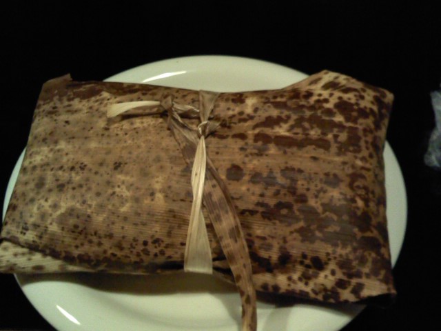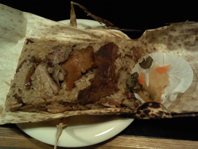 竹の皮を開くと、牛、豚、鳥の3種類のおこわが入っています。