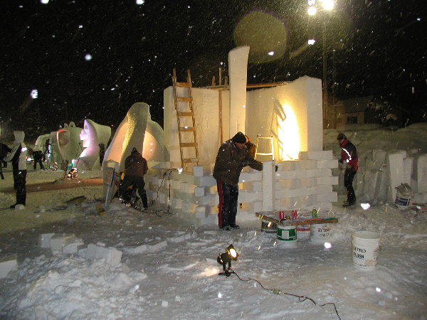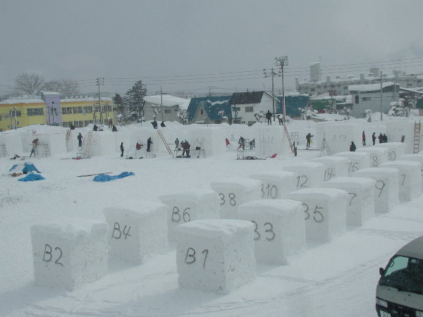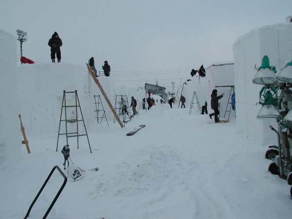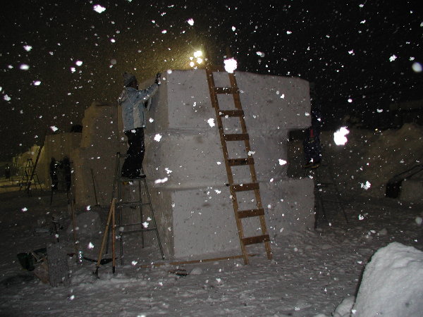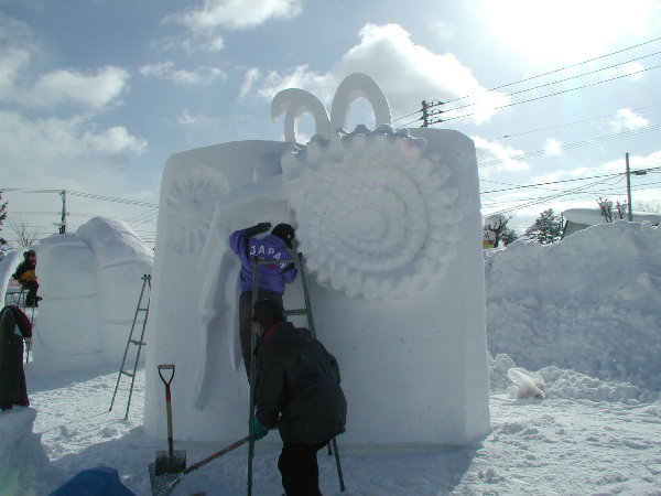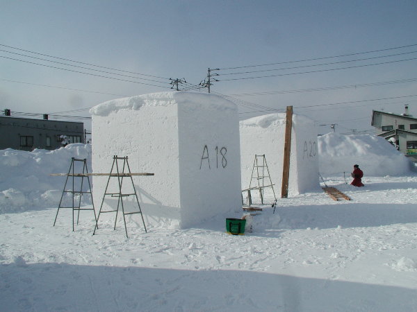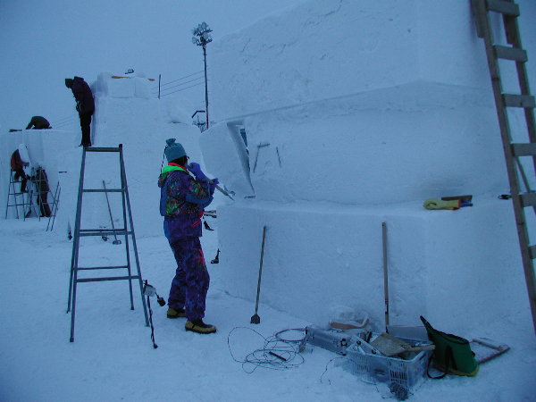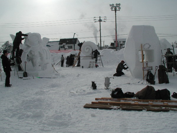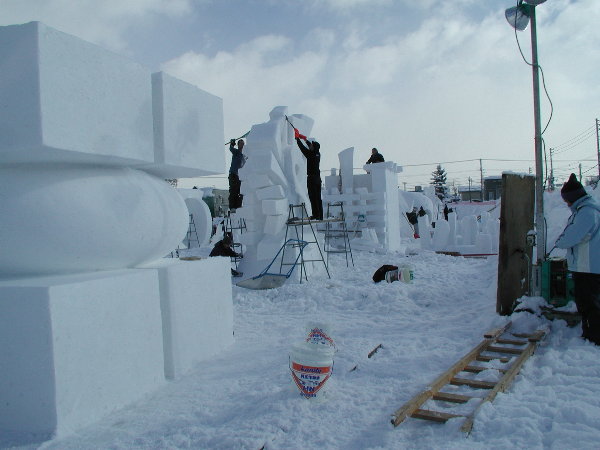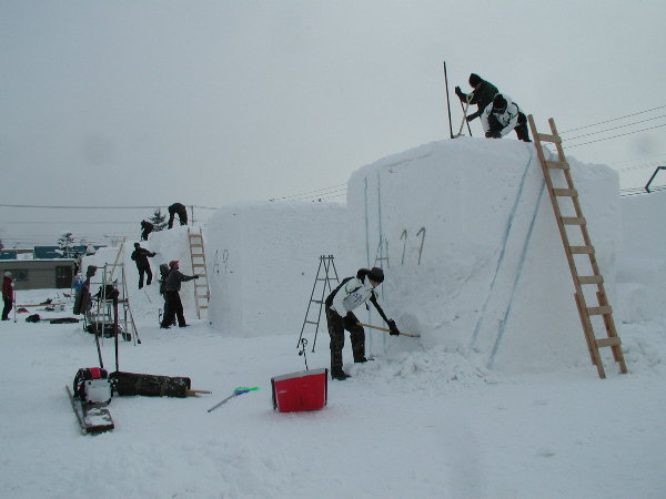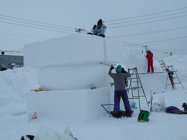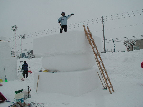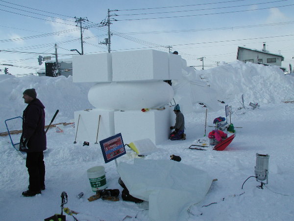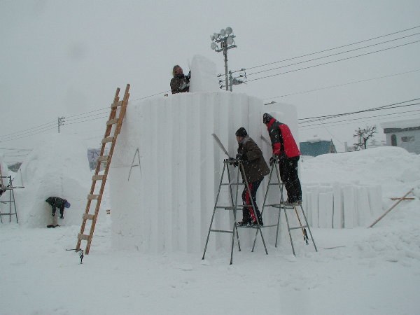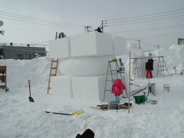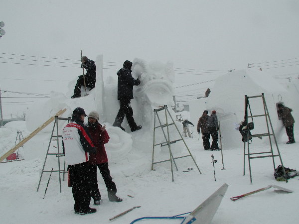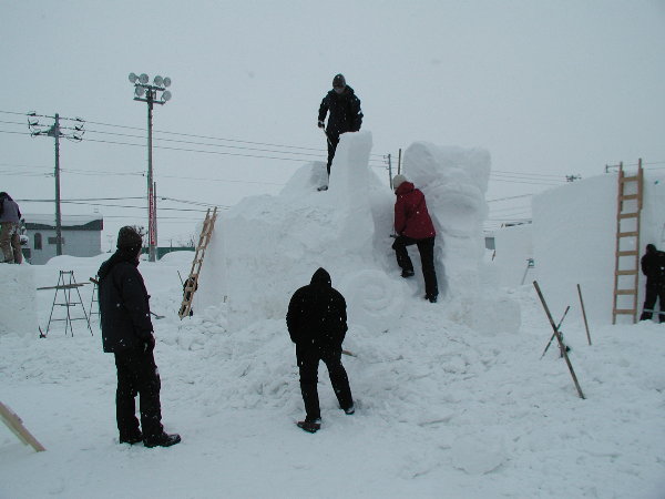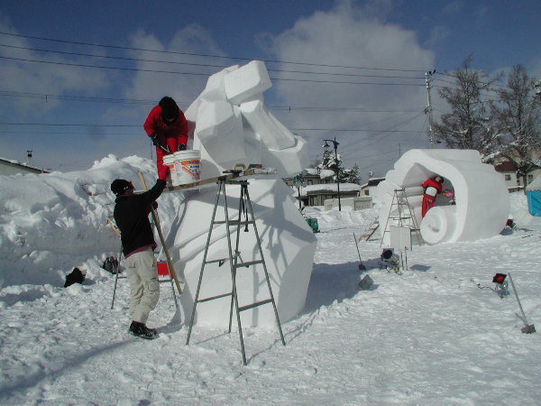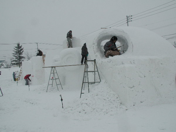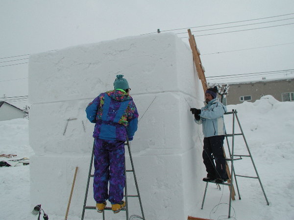 湿った雪なので制作中の作品に雪がくっついてしまって作業しにくいだろうということです。